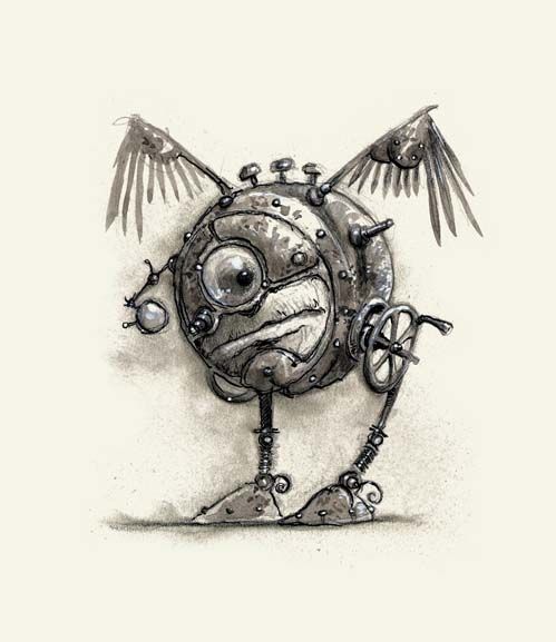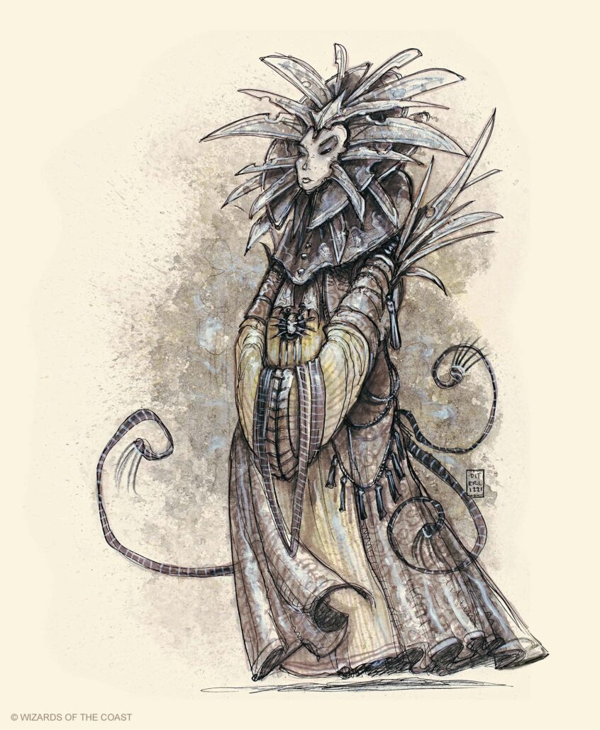 Pozostańmy na chwilę przy koncepcji modronów. We wspomnieniach zawartych w albumie Realms Tony DiTerlizzi opisuje moment, w którym Zeb Cook zaskoczył go niecodziennym wyzwaniem. Cook rozważał wskrzeszenie pomysłu tych mechanicznych istot, znanych z Monster Manual z 1983 roku, lecz nie był szczególnym entuzjastą ich ówczesnej formy. Przekazał więc Tony’emu opis stworzeń i poprosił, by nadał im nowy kształt. DiTerlizzi, zainspirowany koncepcją hierarchicznej społeczności modronów, stworzył zupełnie nowy, charakterystyczny design, który przetrwał do dziś. Jak sam wspomina, przy projektowaniu kierował się duchem Alicji w Krainie Czarów oraz estetyką dzieł Yoshitaki Amano. Uzbrojenie i postawa modronów, z ich cienkimi kończynami i geometryczną równowagą, czerpią bezpośrednio z jego prac.