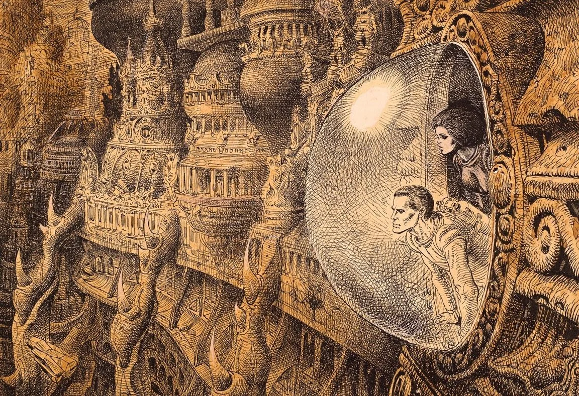 Kolejnym znaczącym artystą, często przywoływanym przez DiTerlizziego jako inspiracja, był Jean Giraud, szerzej znany jako Moebius – francuski ilustrator, rysownik i pisarz, którego twórczość trwale wpłynęła na rozwój fantastyki. Dla Tony’ego Moebius był wizjonerem o niezwykłej wszechstronności, tworzącym zarówno opowieści z Dzikiego Zachodu, jak i epickie space opery czy baśniowe światy fantasy. Artysta eksperymentował również z perspektywą i przestrzenią. Jego ilustracje emanują poczuciem nieskończoności, obcości i otwartości światów, zachęcając odbiorcę do zanurzenia się w niezwykłych rzeczywistościach. Jean Giraud zapisał się również w historii filmu, współtworząc rysunki koncepcyjne do Piątego Elementu (1997) i współpracując z H.R. Gigerem i Ridleyem Scottem przy Obcym (1979).
